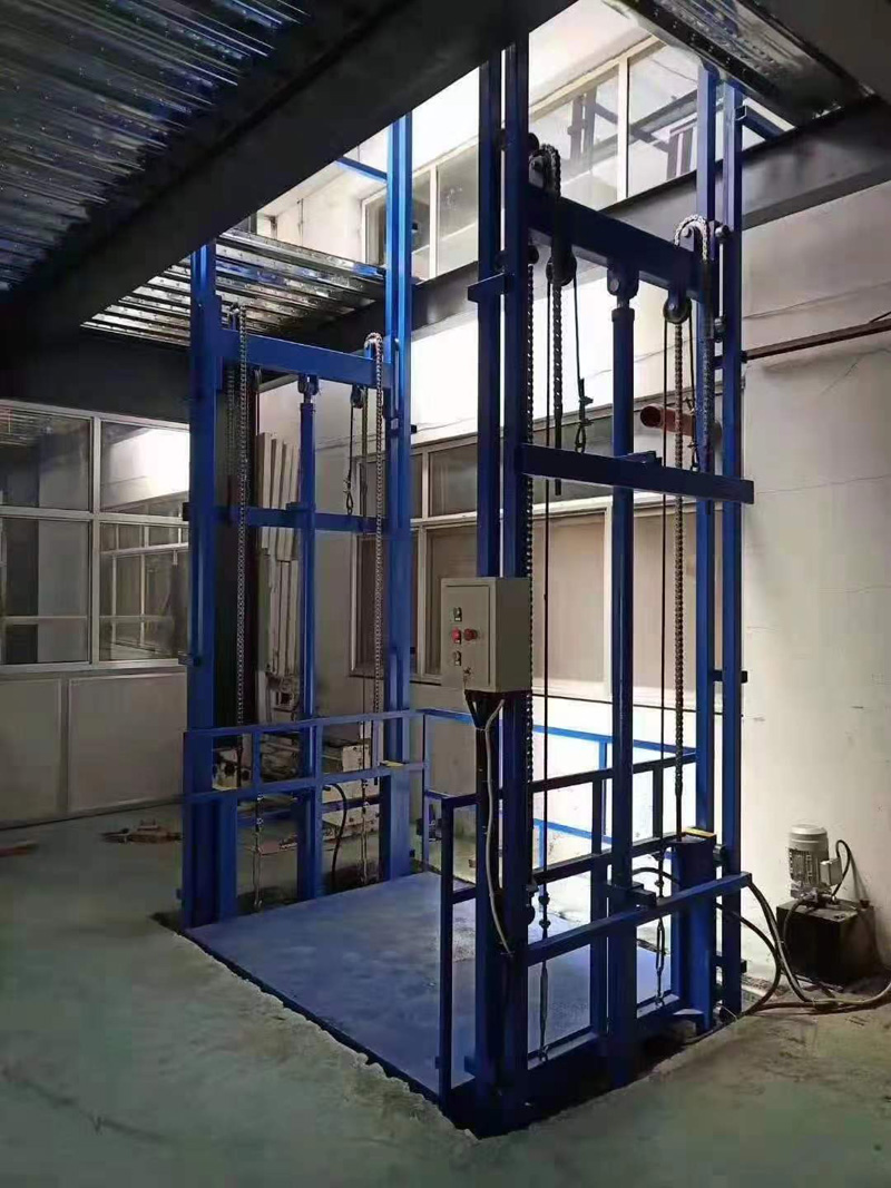 導軌式升降貨梯主體結構使用鋼材焊接而成,故而具有載重量大,強度高,耐磨損等突出優點;臺面采用高強度防滑花紋的鋼板,抗壓、耐磨、防滑,使貨物在運輸過程中更穩固;導軌采用H型鋼,其抗彎能力強、直線精度高,設備運行更加安全平穩。